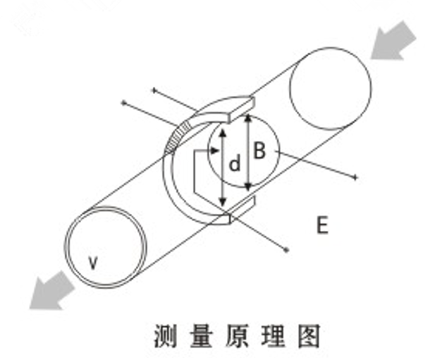 測量流量時,導電性液體以流速V流過垂直干流動方向的磁場,導電性液體的流動感應出一個與平均流速成正比的電壓,其感應電壓信號通過與液體直接接觸的電極檢出。對于同一流量計S. B. d為常量,所以流量與感應電動勢E(或流速V)的大小成正比。