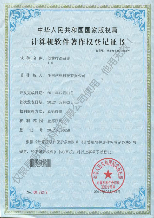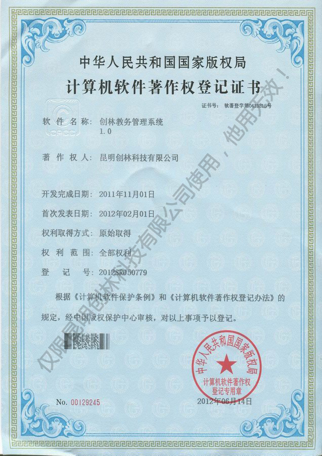 教務管理系統軟件著作權登記證